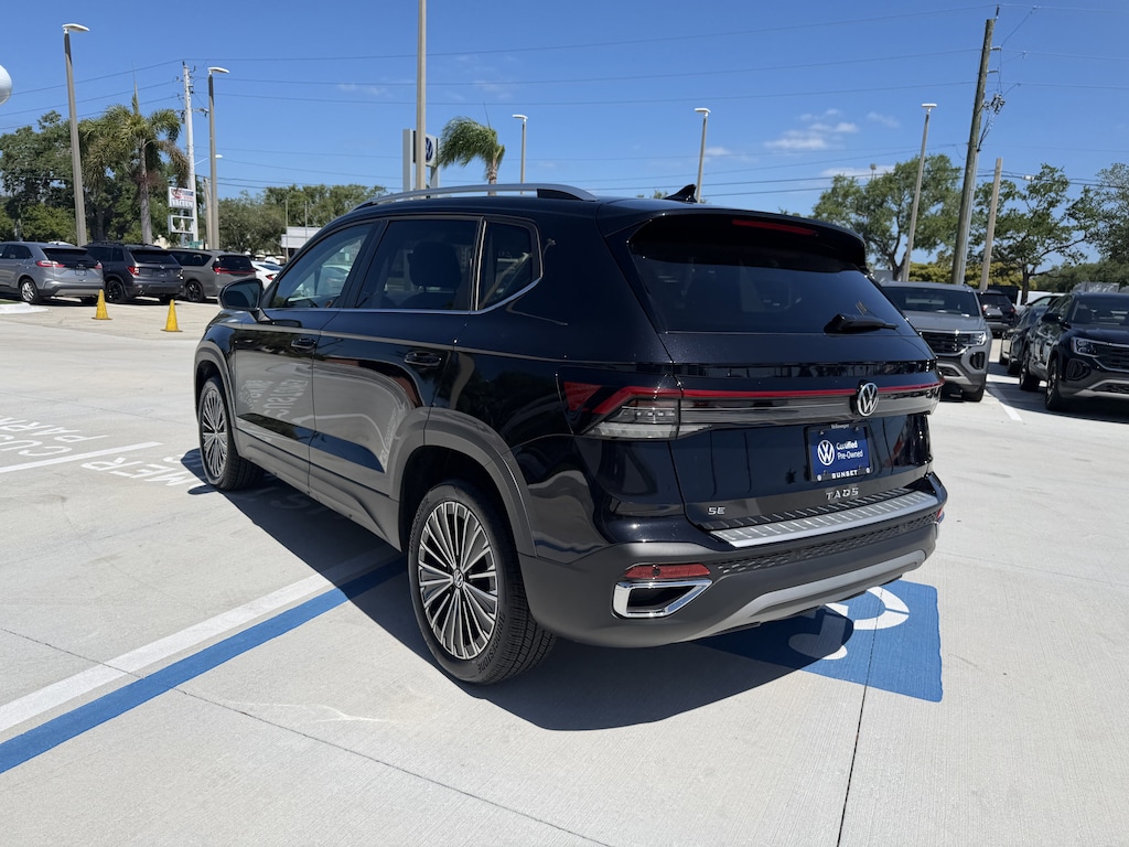 Pricing excludes tax, tag, title and pre-delivery service fee of $999 and private tag agency fee of $24.40. *See below for details..Sunset Volkswagen of Sarasota Courtesy Vehicle with Only 4,100 Miles..Wow this Taos 1.5T SE includes Active Blind Spot Monitor..Rear Cross Traffic Alert..Travel Assist (semi-automated driving assistance)..Lane Keeping Assist..Adaptive Cruise Control with Stop & Go..Lane Assist..Emergency Assist..Backup Camera..Forward Collision Warning with Autonomous Braking and Pedestrian Monitoring..Apple CarPlay/Android Auto..8" Volkswagen Digital Cockpit..8" Touchscreen..Remote Engine Start..Satellite Radio..Bluetooth..Dual-Zone Climate Control..18" Alloy Wheels..Front/Rear USB Ports..Park Assist Sensors..Wireless Phone Charging..Heated Seats..LED Headlights..Onboard Wi-Fi..Turbocharged, 1.5L 174 HP 4 Cylinder..8 Speed Automatic Transmission..All power equipment and more...Volkswagen Certified Pre-Owned means that you not only get the reassurance of a 2yr/24,000 mile Comprehensive warranty, but also a 112-point inspection/reconditioning, 24hr roadside assistance, and a complete CARFAX vehicle history report. When it comes to car shopping, confidence is a powerful commodity. And through the Volkswagen Certified Pre-Owned program, we aim to instill that confidence from first sight to test-drive to time of purchase and beyond. So you can move forward in a vehicle you can't wait to show off. When quality and value come together like this, you get something truly outstanding. Rigorously tested and meticulously inspected, these vehicles offer what non-VW dealers cannot match. Or certify. Because with our superior brand knowledge comes the expertise you need to go with confidence. All pre-owned cars regardless of make and model are driven and evaluated by our highly qualified service personnel. Call Our Sales Team Now at 941-921-8080 for More Info, a Test Drive Appointment or to have a Custom Video Sent to you on this Vehicle. We invite you to come see our brand new state of the art dealership and take a test drive with one of our highly trained Volkswagen Specialists. You will be glad you did. Fast Out Of State Shipping Available..What the reviews say..What's new, Revised styling. Updated interior with new controls, improved materials and a larger touchscreen. More powerful engine. The Volkswagen Taos was our top-rated extra-small SUV last year, and updates for 2025 make it an even stronger choice in a popular segment. A big part of the Taos' appeal is its size yes, it's on the small end of the SUV spectrum, but its adult-friendly back seat and sizable cargo area make it genuinely family-friendly. You can't say that about many others in this pint-size class. The Taos is also generally well-rounded, with a powerful and efficient engine, a refined driving experience, above-average interior quality and ample feature content. The 2025 Volkswagen Taos is refreshed and receives a variety of updates to distinguish it from last year's model. While its revised exterior styling is the most noticeable update (the full-width LED bar is immediately recognizable at night), what's going on under the hood makes the biggest difference. The turbocharged four-cylinder engine gets a 16-horsepower bump to 174 hp, no doubt improving what was already respectable acceleration. Changes inside include a bigger standard touchscreen, upgraded materials, and a handful of styling enhancements. How does the Volkswagen Taos drive? We were surprised to find the Taos, one of the larger SUVs in this diminutive class, is also one of the quickest. Spacious for a little guy, good cargo room, the closest thing we have to a Golf hatchback now. VW's littlest SUV is right-sized for urban dwellers, and the 2025 Taos's updated looks help set it apart in a crowded segment. A revised engine for 2025, now making 174 horsepower, offers some additional oomph, and the Taos remains an efficient runabout. There's a good amount of space for people and their gear.